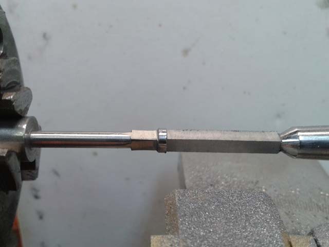 Llegado a este punto, monté en el torno el apoyo para limar y procedí a dar forma a las secciones cuadradas dejándolas a su medida exacta. Primero la intermedia y por último la del extremo.